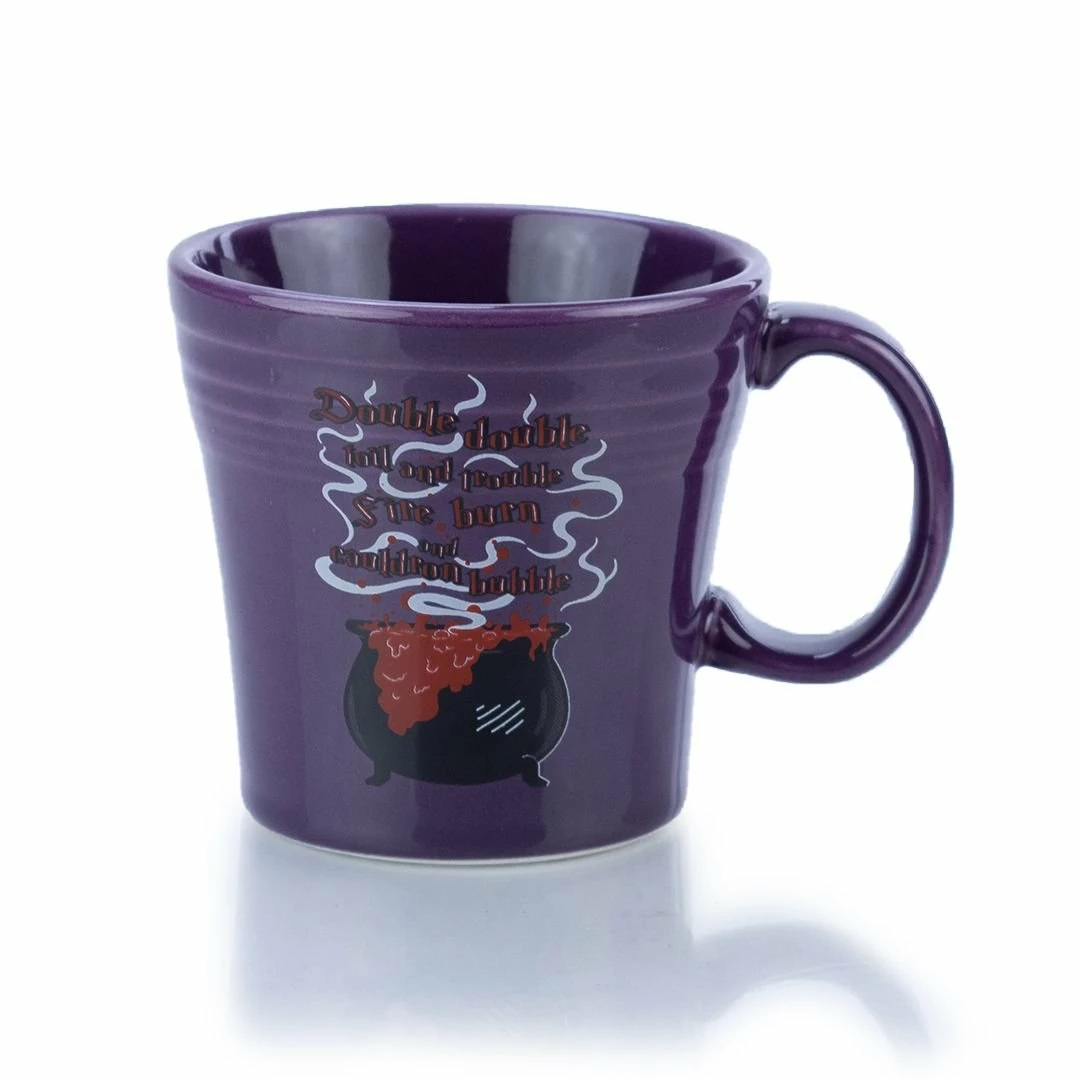 Something wickedly delicious this way comes with the Fiesta® Halloween Cauldron 15 oz. Tapered Mug! This festive Halloween mug features the phrase “Double, double, toil and trouble, fire burn and cauldron bubble” floating above a bubbling cauldron against a Mulberry background for an eerily enchanted look. Crafted of fully vitrified lead-free china that’s durable and resistant to chipping, cracking, and fading, this mug is microwave-safe, making it perfect for enjoying warm apple cider, spiced lattes, & hot chocolate all autumn long. Plus, it’s dishwasher-safe for quick & easy cleaning. For a frightfully delightful mug you’ll love pulling out each Halloween season, try the Fiesta® Halloween Cauldron 15 oz. Tapered Mug!