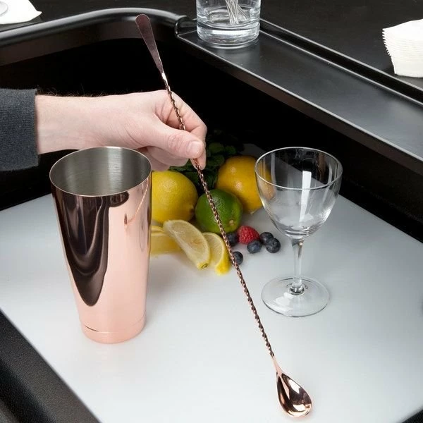 Whether its classics like Old Fashioneds, whiskey sours or martinis or something a bit more trendy – think pumpkin spice Moscow Mules – mixing drinks for your cocktail-loving friends starts with reaching for professional-quality bar tools from Barfly Mixology Gear by Mercer. Show your deft hand at smoothly mixing cocktails made to order or by the pitcher with the Mercer Barfly 17.1” Copper-Plated Japanese-Style Bar Spoon M37011CP. Barfly’s handsome bar spoon is made of a single piece of copper-plated stainless steel that won’t absorb stains or odors that could cloud the taste of fine spirits. This dual-use bar utensil has a precision-molded spoon on one end for accurate measuring, precise pouring, and gentle stirring; the other end is a slightly concave “Japanese Style” machined edge to expertly transport and mix small quantities of garnishes and ingredients. The elegant spiraled handle is designed with a twist to gently blend without bruising, and at a statuesque 17.1” long, it’s perfect for tall drink glasses and pitchers. With such alluring looks and expert performance, Barfly Mixology Gear by Mercer can turn your kitchen into the neighborhood’s trendiest cocktail lounge.