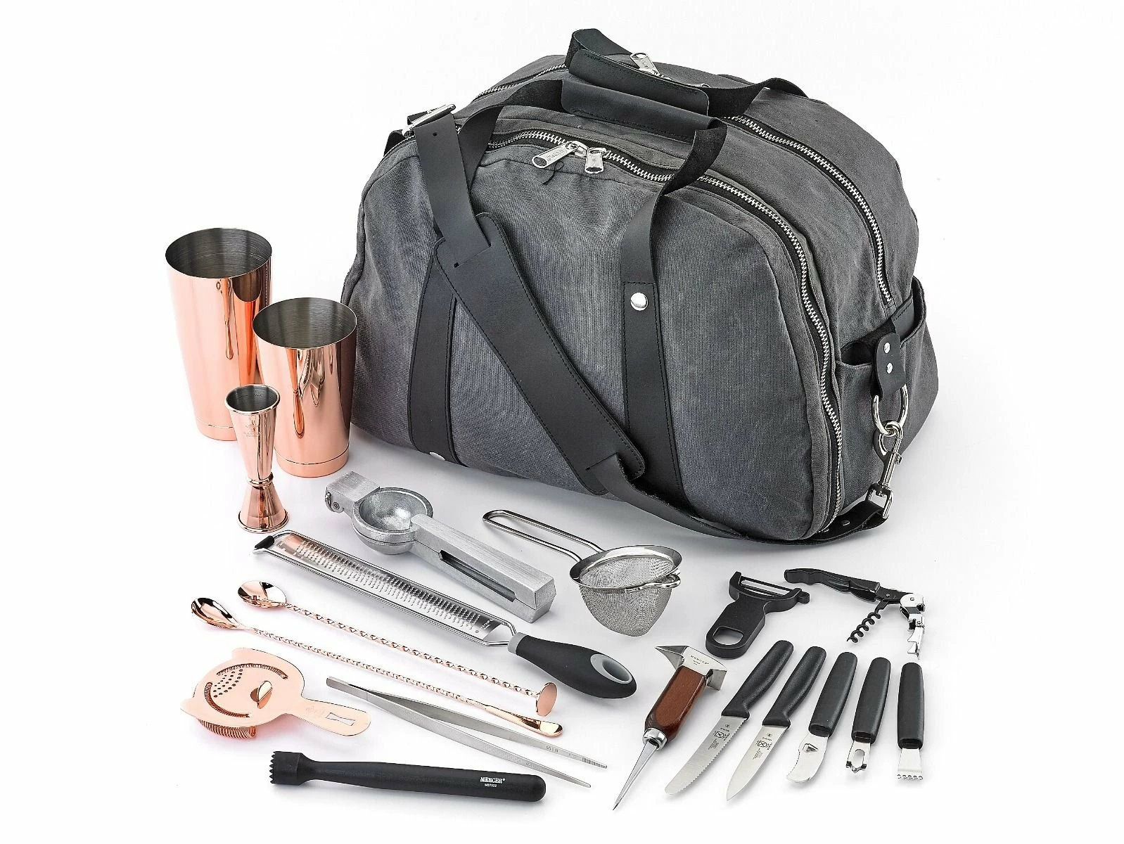 To keep your tools safe and organized while traveling, you’ll also get a bartender gear bag that has a weathered grey, waxed canvas exterior for reliable durability. This stylish bag features 2 sections for storing your equipment, a nylon-lined interior for easy cleaning, and an adjustable/removable shoulder strap, so transporting your equipment is easy, comfortable, and efficient.